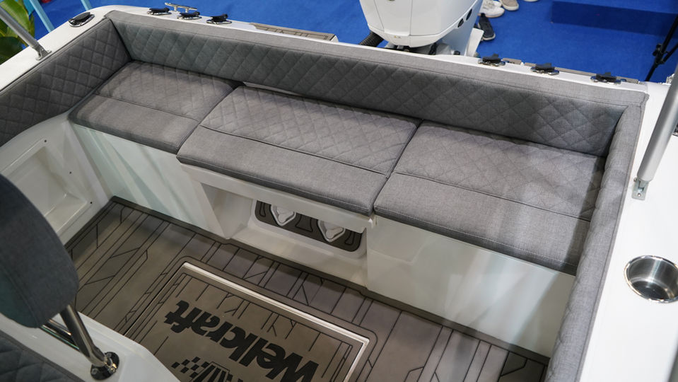 O console central da Wellcraft 200 impressiona pela ergonomia e visibilidade. O painel conta com porta-luvas para proteger eletrônicos, enquanto o banco duplo traz encosto escamoteável: pode ser usado tanto na pilotagem quanto virado para a popa, criando uma área de convivência prática para momentos de pesca ou lazer. Na proa, o layout foi pensado para oferecer mais segurança e funcionalidade, com bordas altas, uma plataforma espaçosa e estofado náutico em “U” idealizado para a pesca, oferecendo apoio adequado para diferentes modalidades.